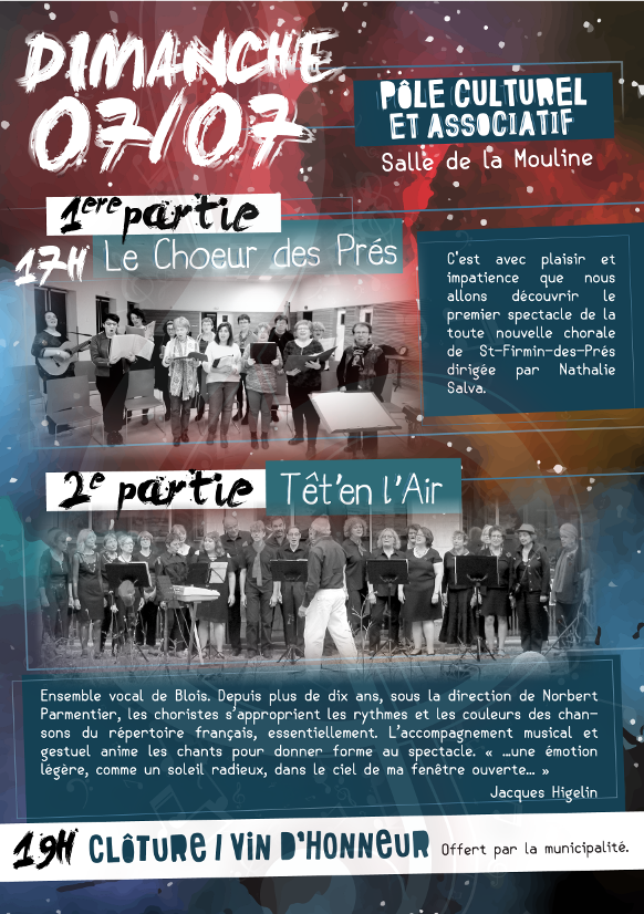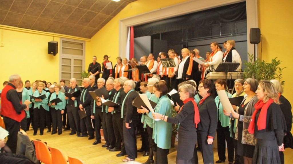 Le chant choral, c’est bon pour le moral, a lancé Claudie Brûlé, responsable de Têt’en l’air, dimanche salle Beauce, en présentant, face à un auditoire venu en nombre, un impressionnant concert choral. Placé sous le signe de l’amitié et de la bonne humeur, ce concert, composé de 120 choristes, devait successivement mettre en scène La Croche cœur de Contres, dirigé par Isabelle Guérin, l’Ensemble vocal du Loir (EN.VO.L) de Cloyes, conduit par Noëlle Mancini, et le groupe vocal, Têt’en l’air, de Blois, dirigé par Norbert Parmentier ; Un maelstrôm de notes et de chansons, souvent scandées par les spectateurs et clôturé en apothéose par un chant commun argentin entonné par les 120 choristes. Basé à Blois, l’ensemble Têt’en l’air, organise fréquemment des rencontres avec d’autres groupes, participe à des concerts de charité et Fête de la musique tous les ans NR du 14/02/2018 J.H.