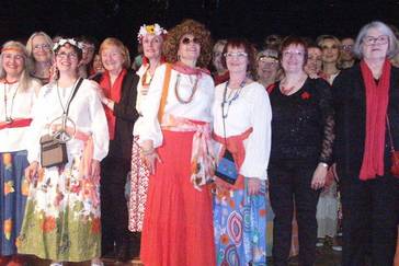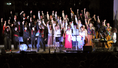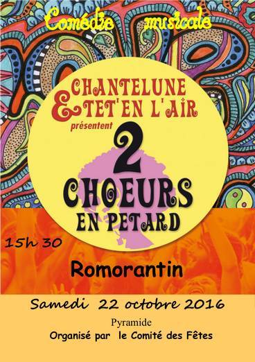 Comédie musicale Deux choeurs en Pétard ( Têt’en l’air de Blois et Chantelune de Cellettes )dirigés par Norbert Parmentier, accompagné de Pierre Rebours au piano. Des messages de paix ont été passés à travers des textes et des chansons tant par la mise en scène de la comédie que leurs costumes très colorés un répertoire de chansons françaises dynamiques. » Hippies’ en chæur » Retour dans les années 70 au coeur d’une joyeuse communauté de hippies ! Cette comédie musicale a déjà été jouée avec succès dens plusieurs communes du départements cette fois, on privilégie une << ambiance baba cool >> ! NR du 14/10/2016