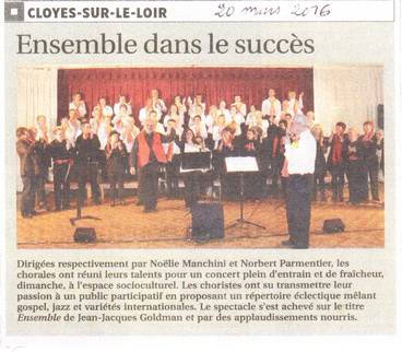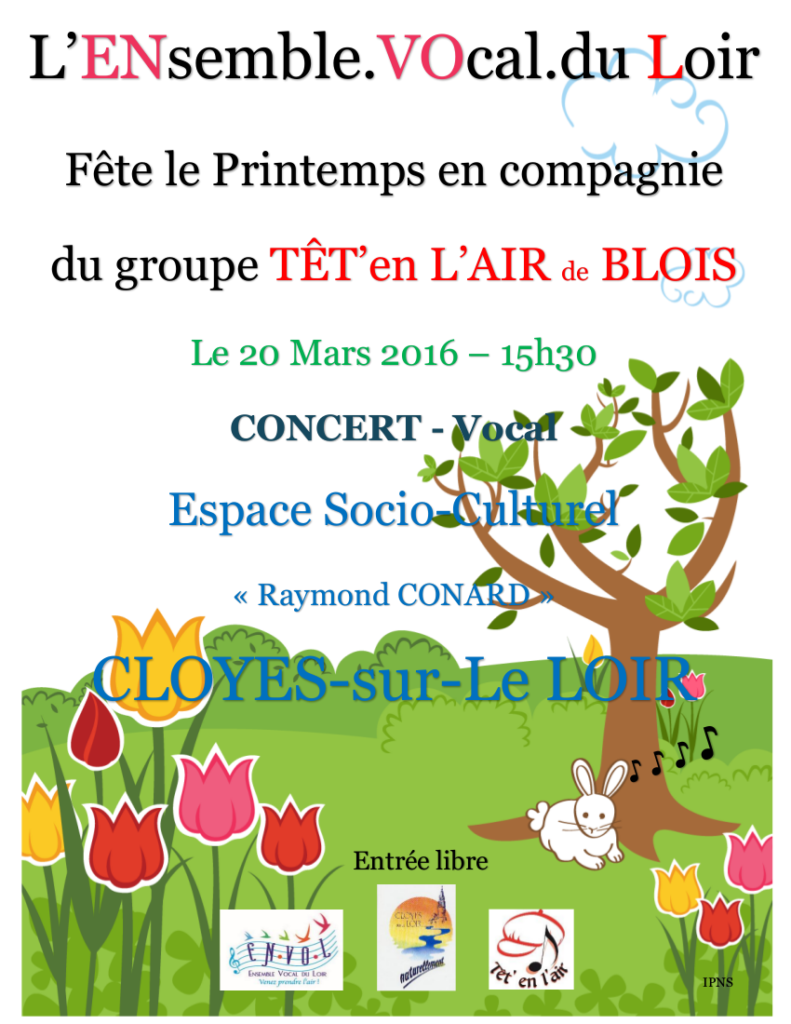 Mars 2016 Fête du Printemps à Cloyes sur Le loir (28) à l’invitation de la Chorale L’Envol, L’Ensemble Vocal du Loir, une belle rencontre avec un public chaleureux
