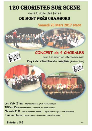 120 choristes chantent au profit de l’association : PAYS DE CHAMBORD / TANGHIN Une salle comble à Mont-près-Chambord, samedi soir, a accueilli un concert solidaire, coordonné par Lydie Merceron, au profit du village de Tanghin, au Burkina Faso, parrainé par l’association intercommunale Pays de Chambord-Tanghin, regroupant les cinq communes de Huisseau-sur-Cosson, Saint-Claude-de-Diray, Saint-Laurent-Nouan, Mont-près-Chambord et La Ferté-Saint-Cyr. Les notes étaient données par les chorales?: 2M en chœur, Les Voix z’ins, l’école de musique de Saint-Laurent-Nouan, Têt’en l‘air. La soirée s’est terminée par un final africain endiablé?! Le bénéfice de cette soirée contribuera à l’agrandissement du lycée par une classe de terminale, puis à une coopérative de femmes (création d’une savonnerie au karité, un atelier de tissage et formation de couturières). NR du 29 mars