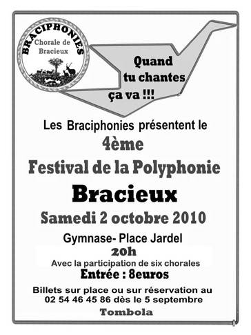 Participation aux Braciphonies, 4ème Festival de la Polyphonie, à Bracieux le 02 octobre 2010. Chanter, une thérapie comme une autre. Les Braciphonies ont décidé de rassembler toutes les chorales de la Région Centre qui partagent cette idée, autour de la chanson de Nana Mouskouri : « Quand tu chantes, ça va ». Un programme varié…